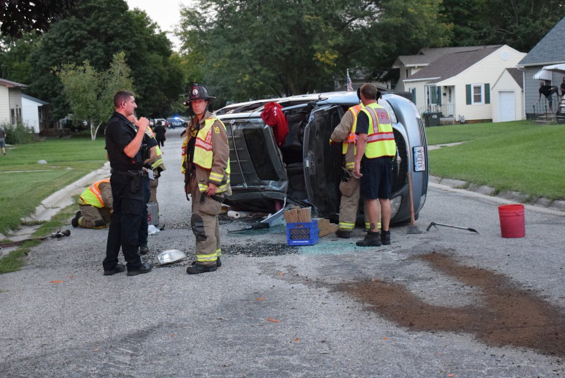 Members of Fort Dodge Fire Rescue and the Fort Dodge Police Department work at the scene of an accident Sunday on B Street, where a car is flipped on its side.
