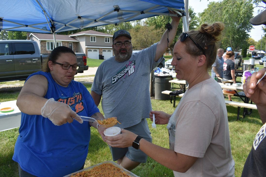 Kendra Sassman, of Fort Dodge, left, serves up a sampling of noodles to Missy Ewing, of Otho, during the first ever Noodle Fest at Otho City Park on Saturday. Tim Wilson, of Fort Dodge, is pictured in back.