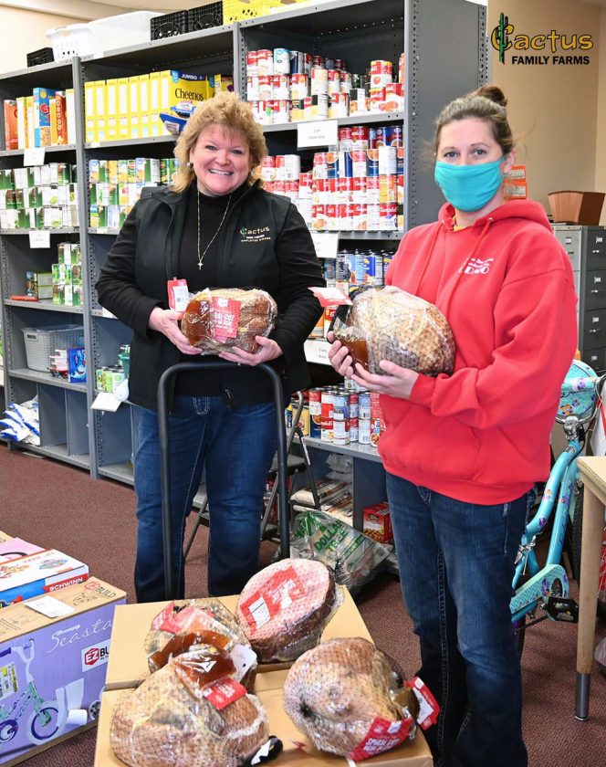 Shelly Bergeson, a Cactus Family Farms employee, delivered hams to the Upper Des Moines Food Pantry in Webster City recently. Jamie Flygstad was on hand to accept the donation. Across Iowa, Cactus Family Farms donated more than 1,350 pounds of ham to pantries, shelters and other community entities.