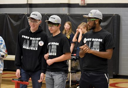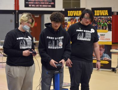 Caz Birkey, 13, an eighth-grader; Taeton Moore, 18 a senior; and Fisher Novencido, 16, a junior, compete in the robotics league championships Saturday at Fort Dodge Senior High.