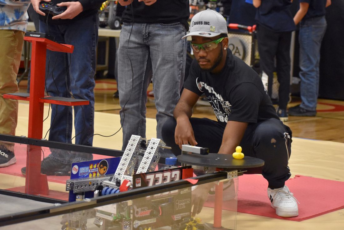 The 7332 Dodger Bots scores a rubber duck Saturday during robotics league championships at Fort Dodge Senior High.
