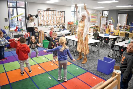 Students in Amber Murray’s preschool class at the Early Childhood Center start the day with 100 jumping jacks to celebrate the 100th day of school.