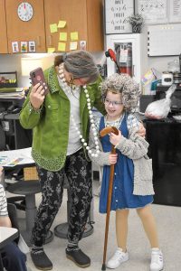 Kindergartner Milah Miller was happy to show off her old lady clothes when she arrived to Shawn Russell’s class, proud of the wrinkles her mom drew on her face.