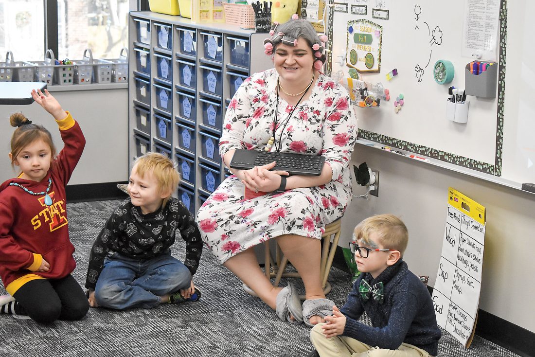 Kindergarten teacher Morgan Merrill dressed up as an old lady with gray hair and a housecoat to celebrate the 100th day of school at the Early Childhood Center on Thursday.