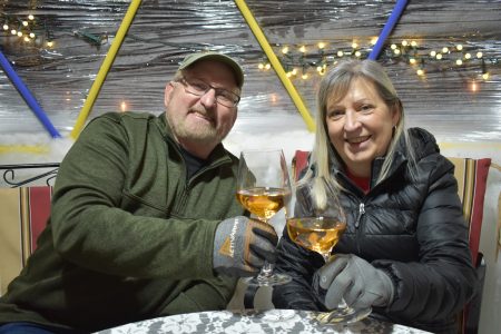 Kevin Thompson, of Fort Dodge, and his wife, Diana, share a toast inside their igloo.
