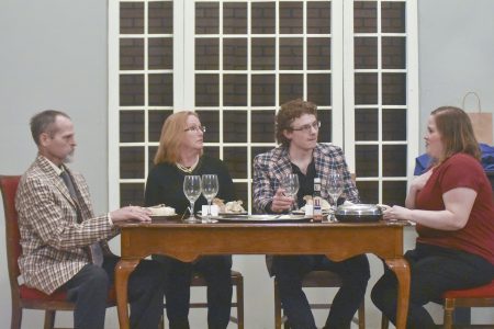 The cast of the Hawkeye Community Theatre’s production of “Dead Man’s Cell Phone” rehearse on Thursday evening. From left are David Pettinger as Mr. Gottlieb, Lori Cassady as Hermia, Jordan Martin as Dwight and Megan Wiebersch as Jean. The show opens on March 30.