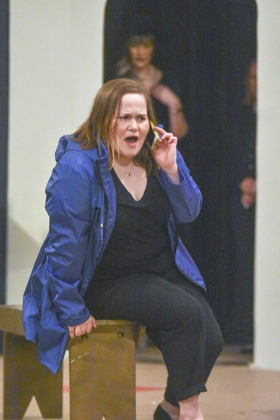 Megan Wiebersch, as Jean, answers the cell phone of the recently-deceased Gordon in “Dead Man’s Cell Phone,” the next production of the Hawkeye Community Theatre. The first show of the season opens on March 30 and runs through April 2.