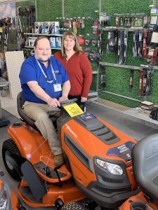 -Messenger photo by Terry Christensen Rick Jones of Sears Hometown Store and Leanne Darr of The Messenger pose with a riding lawn mower like the one a lucky person will win from the Home, Garden, and Lifestyle Show this weekend.