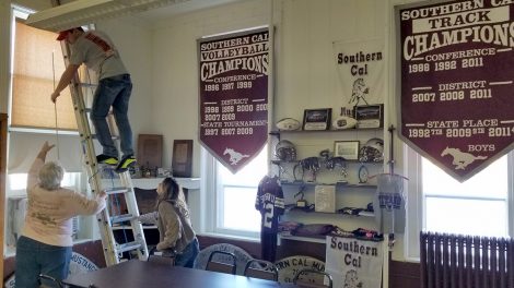 In January 2022, Josh McChesney, and his fiancee, Presley, worked with Central School Preservation, volunteer Rhonda Hanks, left, of Lake City, to display Southern Cal High School banners inside various rooms at Central School. The tall banners, which honored the accomplishments of Southern Cal sports teams and Academic Decathlon teams, were donated by South Central Calhoun High School in Lake City.