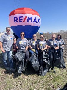 Patrick McKinney, Lindsey McKinney, Lindsay Huffman, Brooke Eischeid, Edward Johll and Cary Clark, all with Re/Max of Fort Dodge, cleaned up litter in the field north of Target on Thursday afternoon in honor of Earth Day.