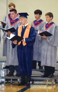 Brodie Anderson, center, sings with the Manson Northwest Webster choir one last time during graduation ceremonies Sunday at MNW High School.
