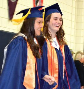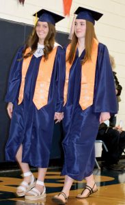Seniors Mackinzie Fahey and Emma Larsen walk down the aisle together Sunday during commencement exercises at Manson Northwest Webster High School.