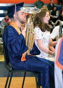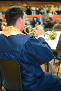 Ethan Stopcynski plays his trumpet one last time with the Manson Northwest Webster concert band Sunday during graduation ceremonies in the high school gymnasium.