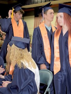 The last row of graduates stands to walk to the stage to receive their diplomas Sunday during Manson Northwest Webster graduation ceremonies. Pictured here are Jaxon Bush, Shawn Kenyon and Emma Woltman.