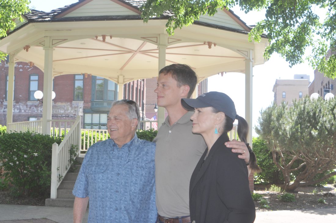 - Messenger photo by Bill Shea State Auditor Rob Sand, center, poses with former state Sen. Daryl Beall and Webster County Supervisor Niki Conrad Friday morning on the Fort Dodge City Square. Sand talked with a small group of people about the work of his office. Sand, a Democrat, is seeking reelection this year.