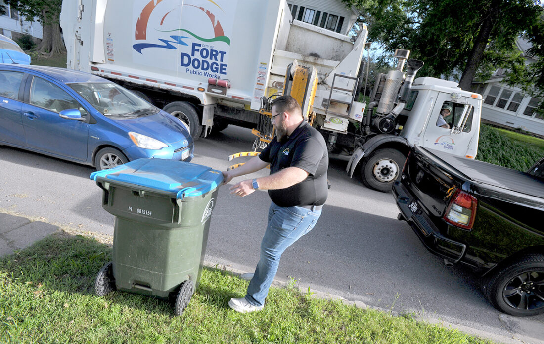 Fort Dodge City Council member Cameron Nelson reaches for a bin that’s blocked by several parked cars as he learns about the city’s recycling and garbage collection services. Nelson has spent time in all the city’s various departments to learn about what they do and what their needs are.