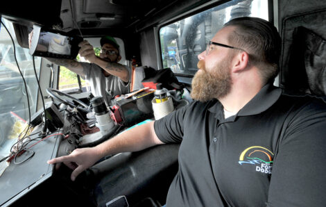 Fort Dodge City Councilman Cameron Nelson watches as Jay Ort, Maintenance 2 Worker with the City of Fort Dodge, adjusts the screen that shows him the bin during Nelson’s time learning about the Public Works Department.