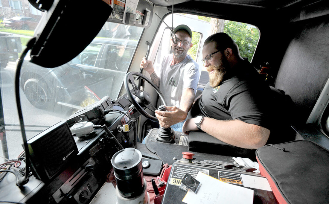 Fort Dodge Public Works Maintenance 2 Worker Jay Ort shows Fort Dodge City Councilman Cameron Nelson how the controls on his truck work as Nelson learns the ropes on a recycling route recently.