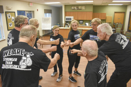 Participants of the Rock Steady Boxing class at Friendship Haven finish each class with a huddle and repeating their motto: “We are stronger than Parkinson’s.”