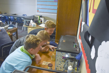 Students in Hannah Barton’s seventh and eighth grade class at Community Christian School check out their tank of classroom goldfish on Friday.