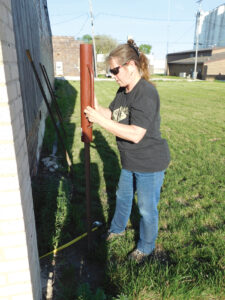 Denise Heimgartner, of Manson, works to put stakes in the ground as support for a cattle panel. Heimgartner planted flowers there this summer to accent the Hidden Gems billboard on Manson’s main street.