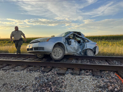 Webster County Sheriff’s Deputies assess a vehicle that had just been struck and dragged by a train in rural Webster County near Samson Avenue and 160th Street on Thursday evening. The accident happened shortly after 6 p.m. The driver of the vehicle was southbound on Samson Avenue when he failed to yield to the westbound train. The train struck the vehicle and dragged it for several hundred yards before it could stop. The driver of the vehicle was alert and talking when first responders arrived and was transported by Vincent ambulance in stable condition.
