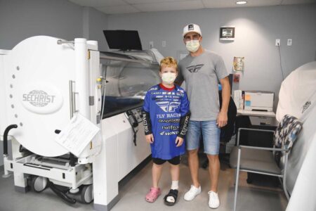 After his treatment on Monday, standing in the waiting room was Fort Dodge Senior High School graduate and retired professional motocross and supercross racer Justin Brayton.