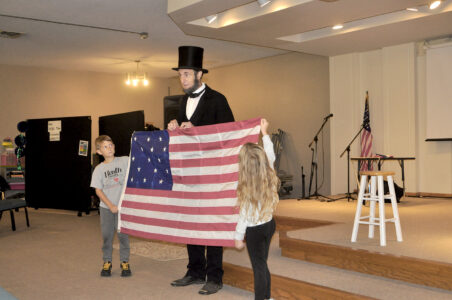 Gideon Heath, left, and Addy Albrecht, right, hold an American flag for President Abraham Lincoln, as portrayed by Kevin J. Wood. The flag is an older version that has 15 stars and 15 stripes, representing the 15 states in the country when Lincoln was born in 1809. Albrecht and Heath are students at Community Christian School, and they helped Wood with the flag during one of his presentations there Friday morning.