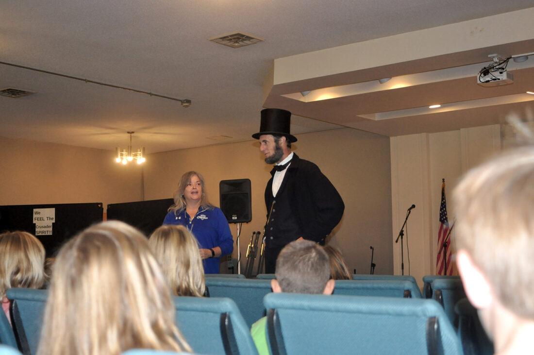 Stephanie Coble-Day, left, the principal of Community Christian School in Fort Dodge, introduces President Abraham Lincoln to kindergarten, first grade and second grade students Friday morning. Kevin J. Wood portrayed Lincoln.