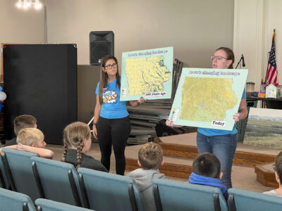 Hannah Preston, youth water outreach specialist for Water Works!, and Alena Whitaker, water quality and conservation educator, show students at Community Christian School images of Iowa’s changing landscape and how it affects the state’s wetlands. Preston and Whitaker gave a Water Rocks! presentation on wetlands at CCS on Monday morning.
