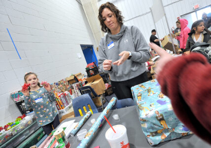 Iowa Central instructor Liz Dent, of Humboldt, spent the day gift wrapping with her daughter Evelyn Dent, 7.