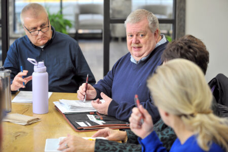 Gery Cook, broker/owner with Regency Realtors, helps lead the discussion during a recent meeting of the newly independent Fort Dodge Board of Realtors in his offices in downtown Fort Dodge. Jim Schwan, a Realtor with Legacy Realty, listens at left.