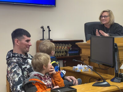 Webster County Drug Court Judge Adria Kester holds Jace and Grayson Casey during their dad, David Casey's graduation from the Drug Court program on Friday morning.