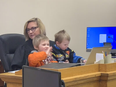 Webster County Drug Court Judge Adria Kester holds Jace and Grayson Casey during their dad, David Casey’s graduation from the Drug Court program on Friday morning.