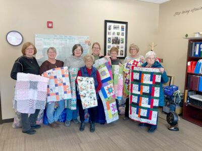 The quilters who produced more than 100 quilts for families served by Webster County Health Department are, from left, Lisa Schumack, Karen Barkley, Ann Wilber, Maddy Haverkamp, Dr. Kelli Wallace of Webster County Health Department, Joann Eubanks, Nancy Riehl and Bev Buske.