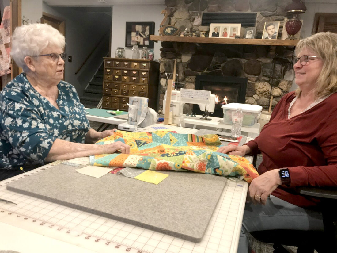 Fort Dodge quilters Bev Buske and her daughter Karen Barkley sit and discuss the quilting project in their expansive basement work area.