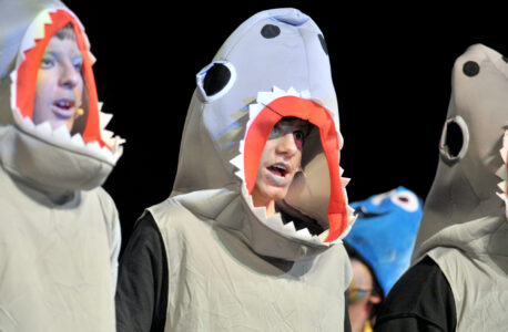 Kyran McKrady, who plays Bruce the Shark, helps his fellow sharks learn that “fish are friends not food” during the Fort Dodge Middle School production of “Finding Nemo Jr.” Thursday morning.