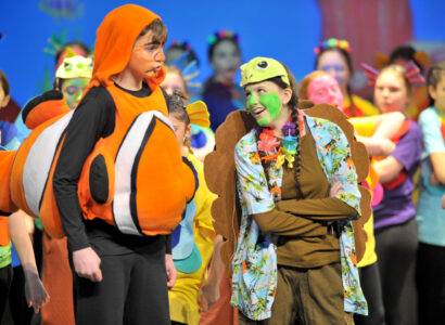Brek Pingel, at left, as Marlin, along with Dory, played by Lauren Patterson, welcome Nemo back during the Fort Dodge Middle School performance of the musical “Finding Nemo Jr.” Thursday morning. Nemo is played by Damien Yeoman. The MIddle School students performed for fourth grade class. Public performances are tonight and Saturday. Both shows are at 7 p.m. with doors opening at 6. Tickets are $5
