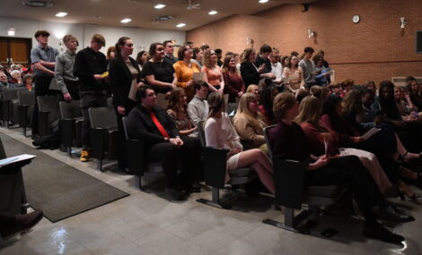 National Honor Society inductees stand during the induction ceremony Sunday night in the Gail Niceswanger Little Theater.