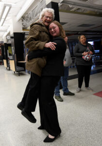 Britta McCollum, of Fort Dodge, carries her grandmother Helen Vetter, of Manson, around the Fort Dodge Senior High cafeteria after the National Honor Society induction ceremony Sunday evening.