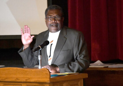 Judge Brown addresses those gathered for the National Honor Society induction ceremony Sunday evening in the Gail Niceswanger Little Theater at Fort Dodge Senior High.