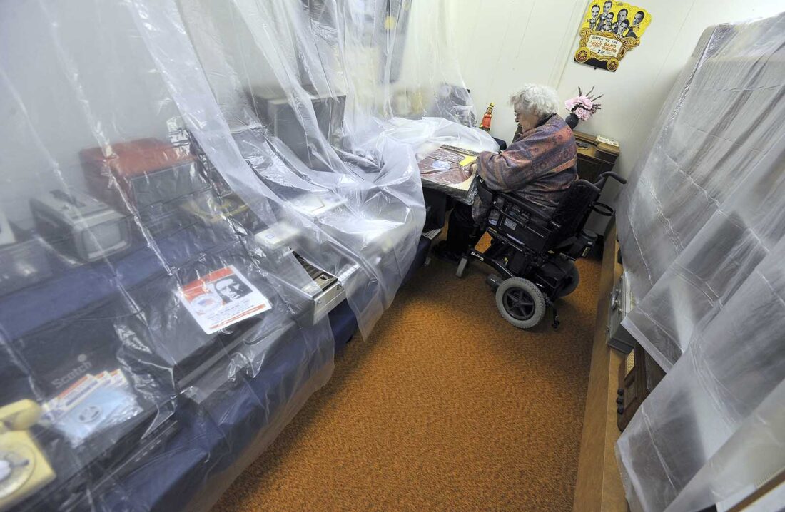 Phyllis Stewart, curator at the Webster County Museum, looks over a record played on-air among the artifacts kept under plastic sheets in the museum. A leaking roof prevented the museum from being open in 2019.