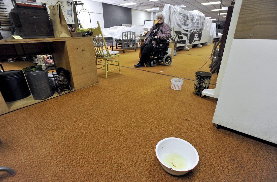 Phyllis Stewart, curator of the Webster County Museum, looks over an area that had standing water on the floor from the leaking roof in 2019.