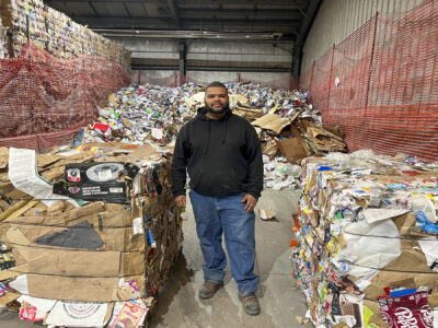 Regional Recycling Center Operations Manager James McLaughlin stands by two cubes of baled co-mingled recycling. All curbside recycling goes through a baler to compress the items before they’re shipped to a sorting facility.