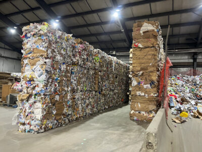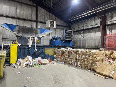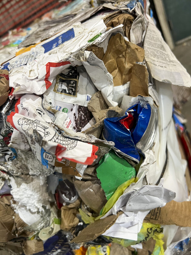 Unsorted curbside recycling goes through a baler to be compressed into blocks of comingled recyclables, which will then be transported to another facility for further sorting.