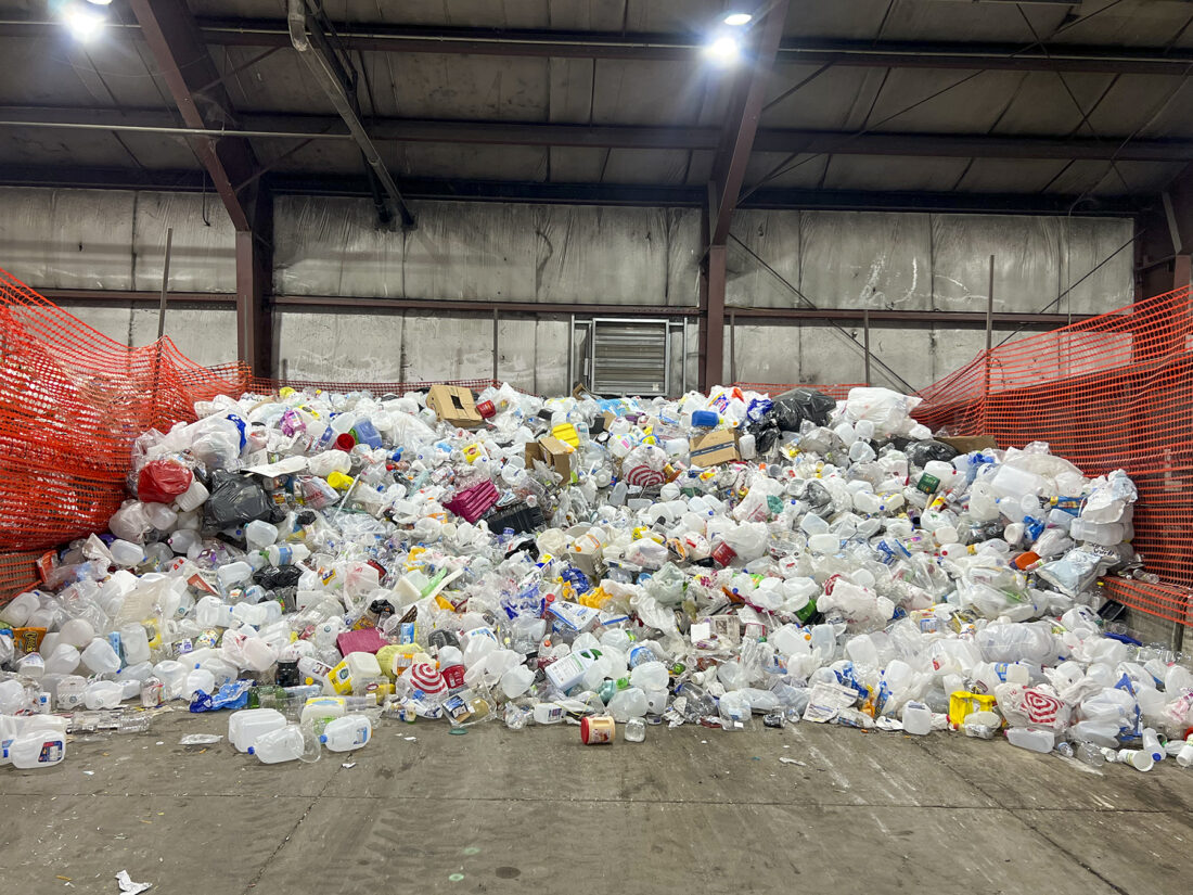 A mountain of plastic bags, bottles, jugs and more sits inside the Regional Recycling Center.