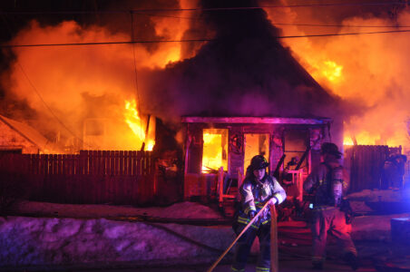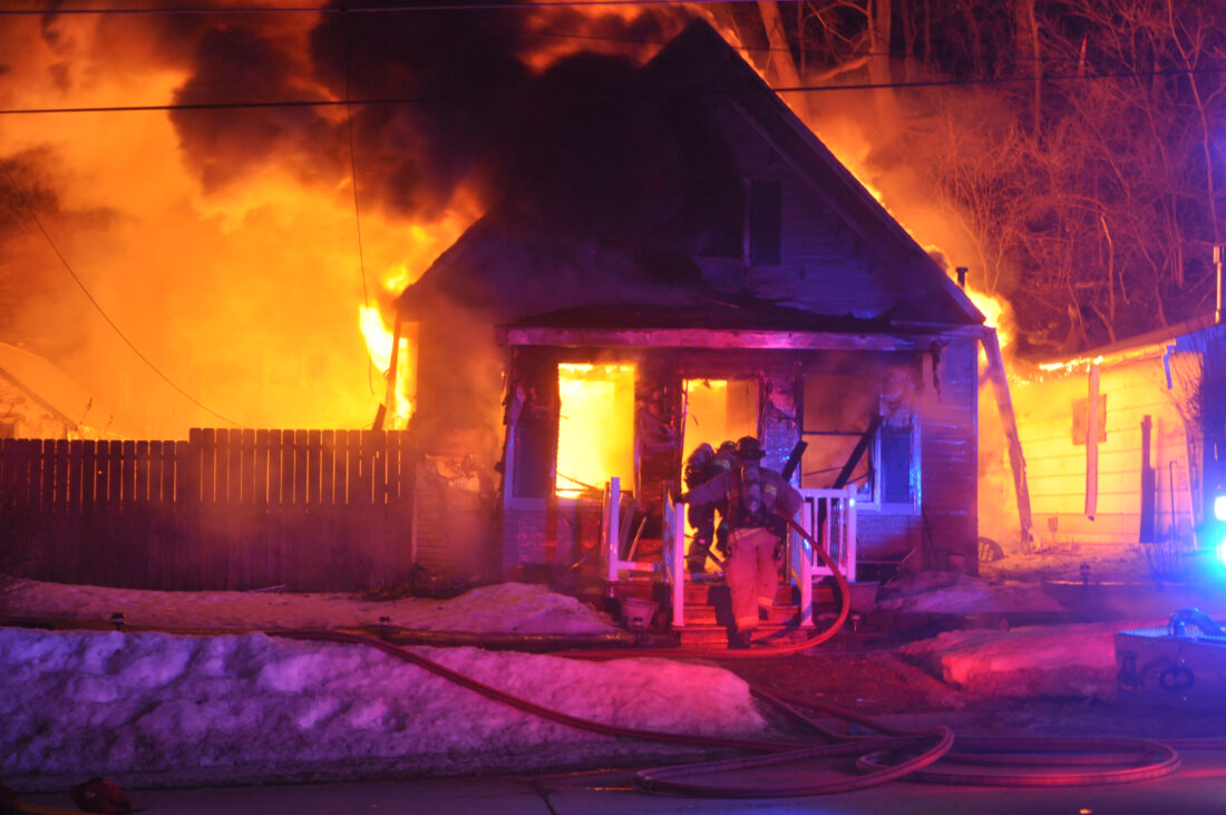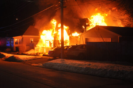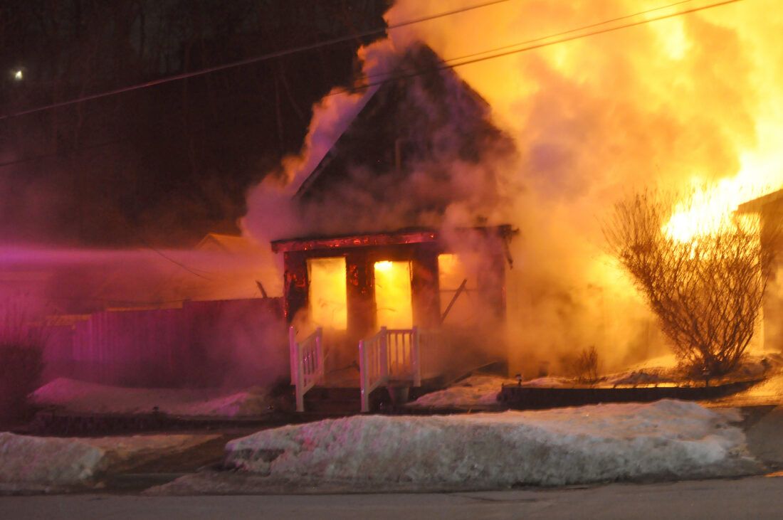Flames erupt from all sides of the house at 341 Haskell St. late Wednesday evening. Two people were injured in the fire that destroyed the two-story house. The fire was reported at about 11:30 p.m. Emergency personnel were on the scene into the early morning hours of Thursday.
