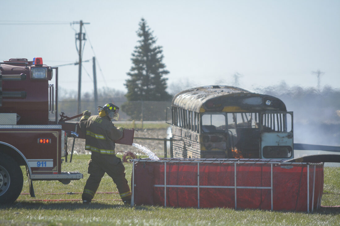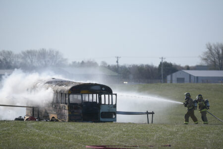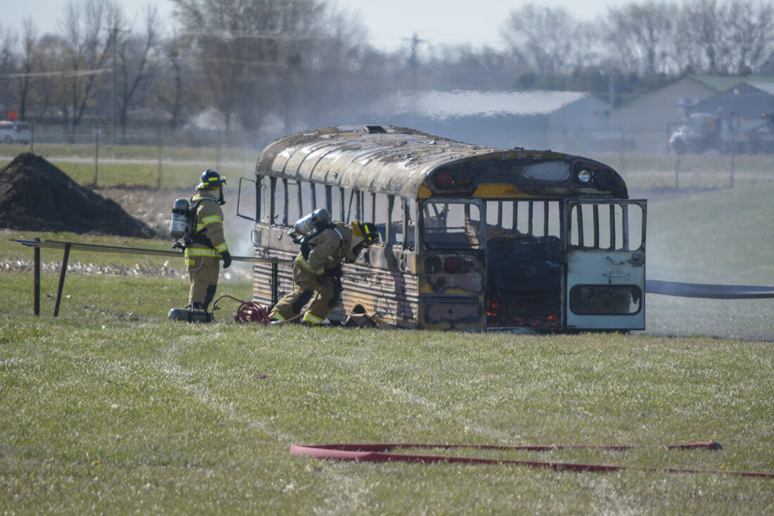 An old school bus was filled with wooden pallets and set on fire to simulate the burning fuselage of an airplane crash during Tuesday morning’s full-scale disaster drill at the Fort Dodge Regional Airport.