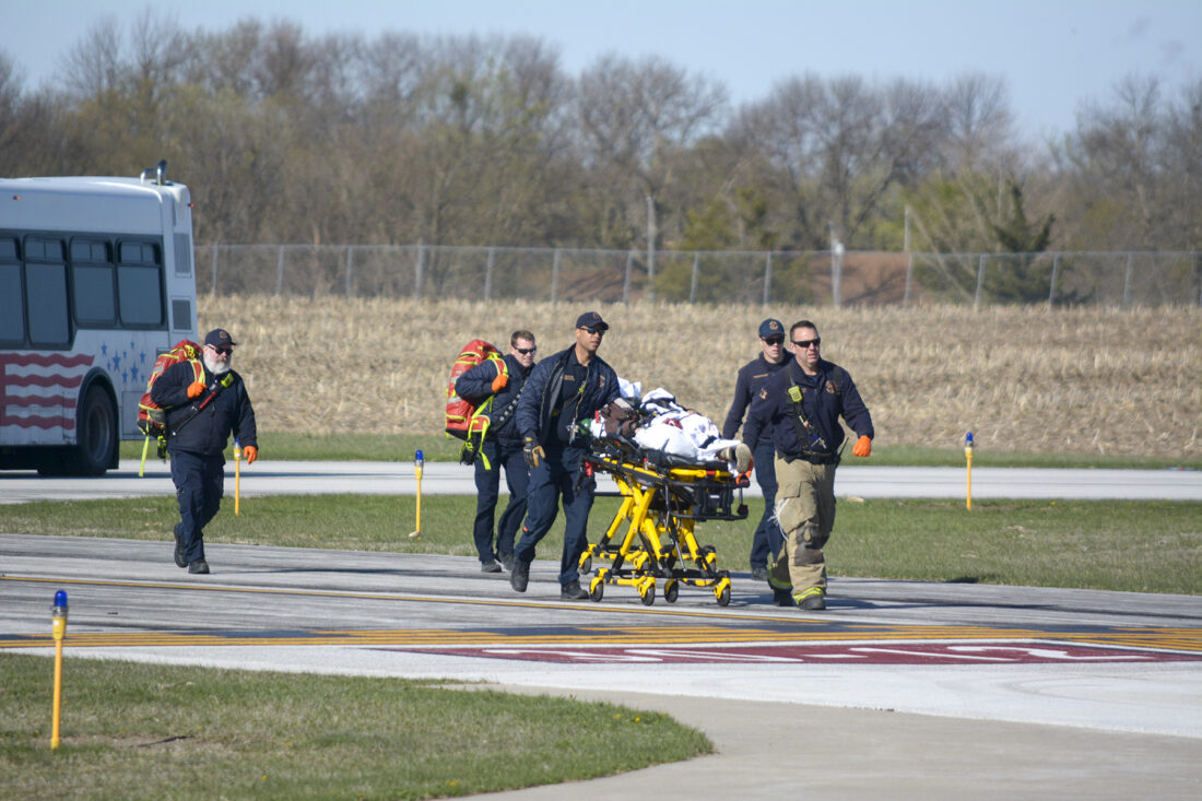 Fort Dodge Fire Department medical personnel wheel a “victim” toward a waiting ambulance during a full-scale disaster drill at the Fort Dodge Regional Airport on Tuesday morning.