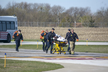 In addition to having Fort Dodge Fire Department ambulances waiting to transport “victims” to the hospital, Hagen and Chambers had UnityPoint Health LifeFlight fly in and land as if to pick up a patient.